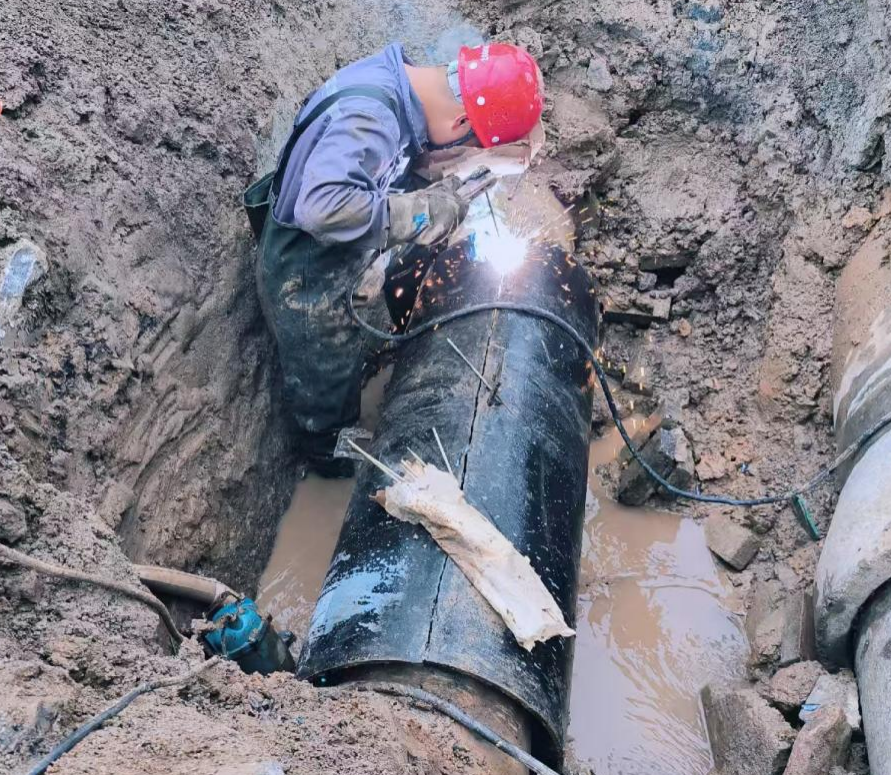 施工现场情况复杂,故障管道埋深达3米,抢修人员顶风冒雨,克服重重困难,加速完成管道清理、融口焊接,历经4小时恢复正常供水。