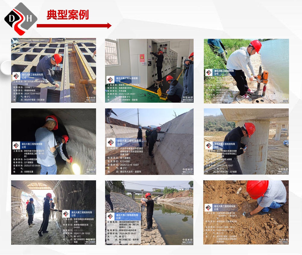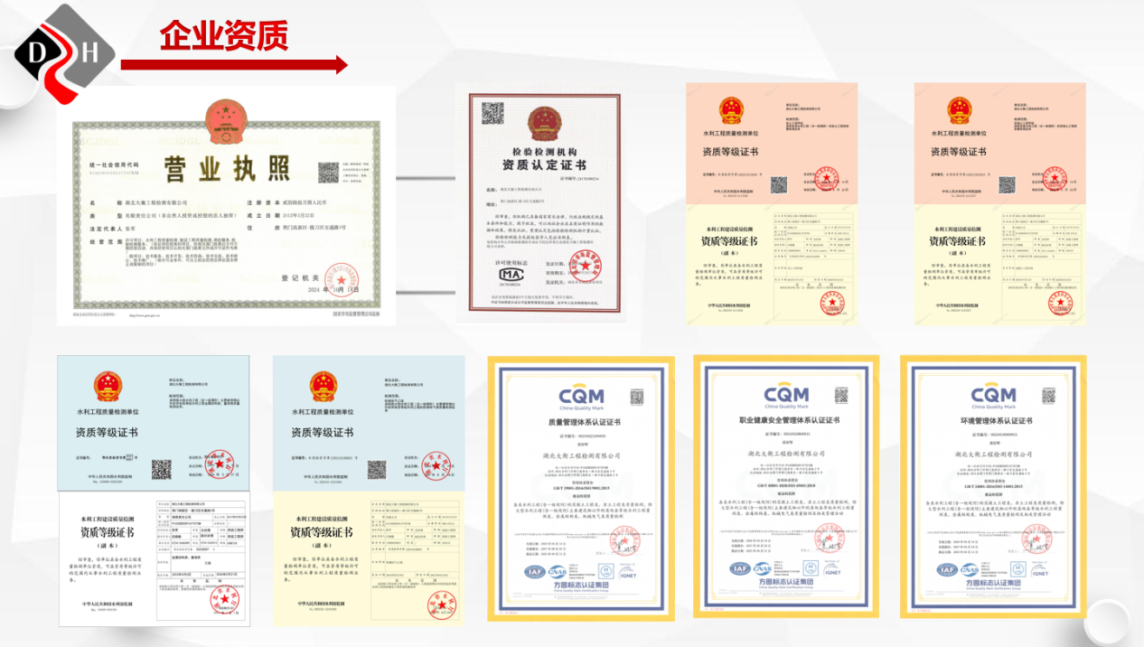 大衡公司持有湖北省市场监督管理局评审中心颁发的CMA计量认证证书(共340项参数),具有水利工程检测资质岩土、混凝土甲级;量测、金属结构和机械电气类乙级。业务范围涵盖水库除险加固、灌区续建配套与节水改造、泵站更新改造、堤防工程、河道治理、农村安全饮水、土地复核等多个领域,陆续在四年承担湖北省水利厅水利工程飞检任务,以诚信经营与专业服务树立行业口碑。