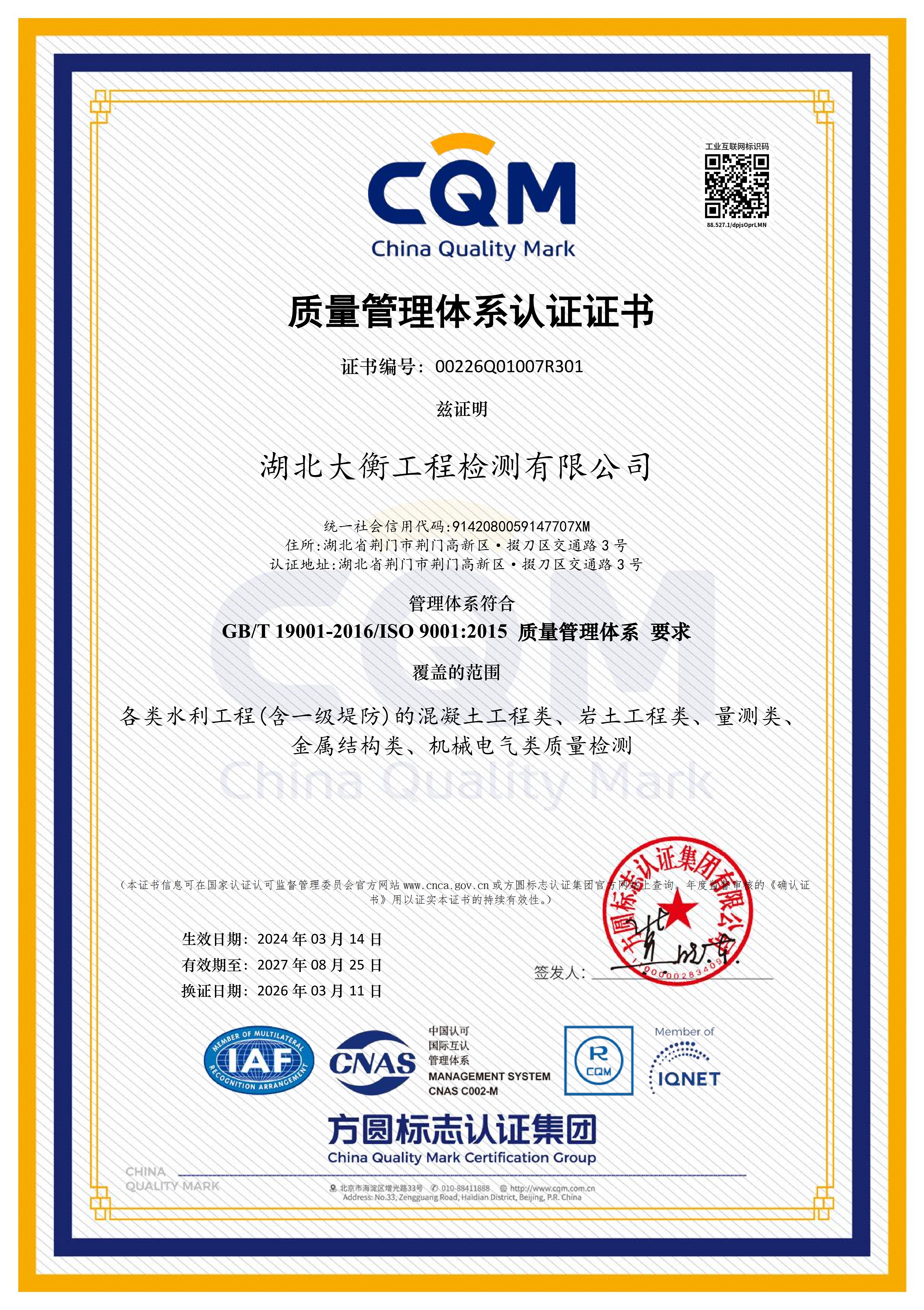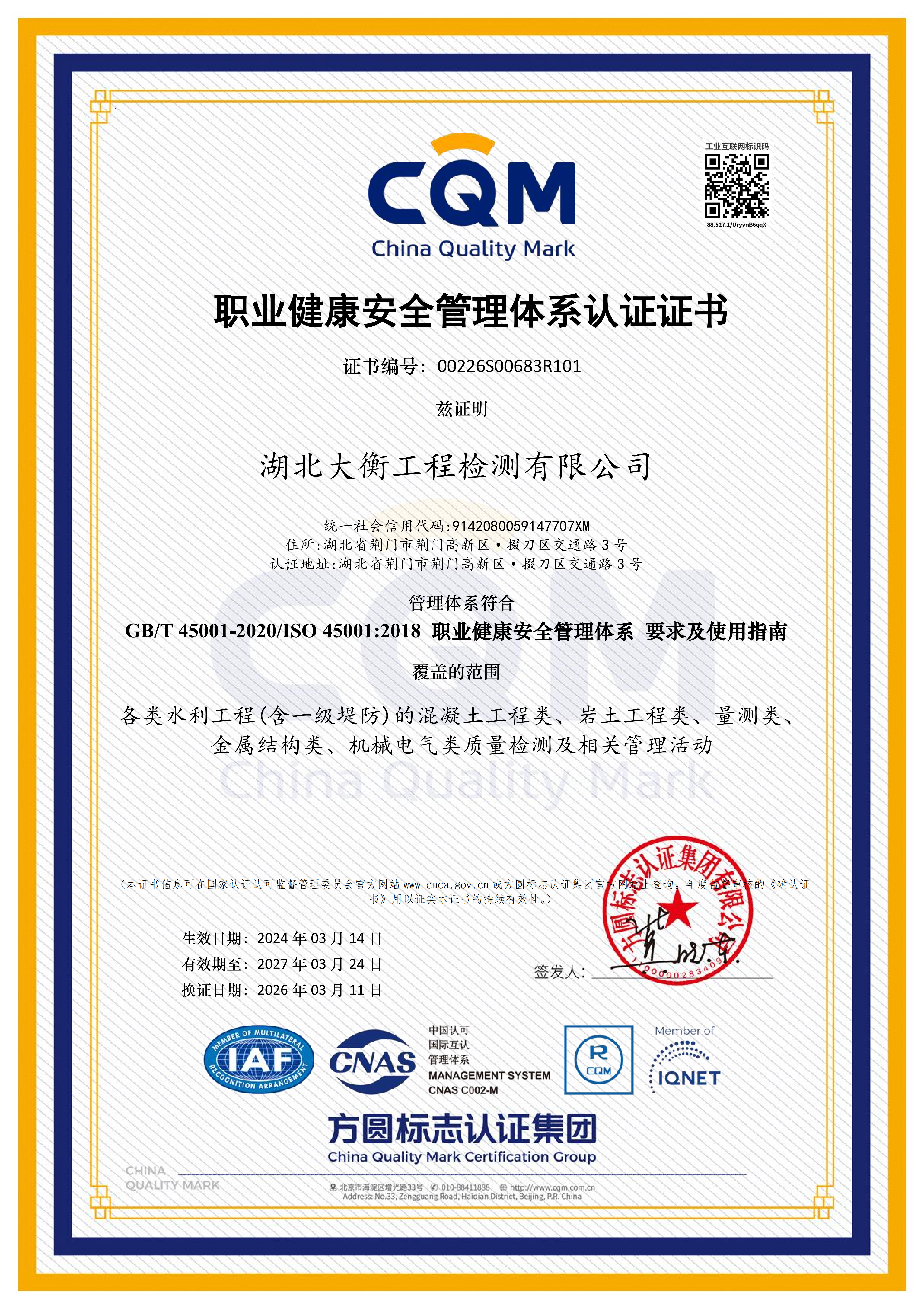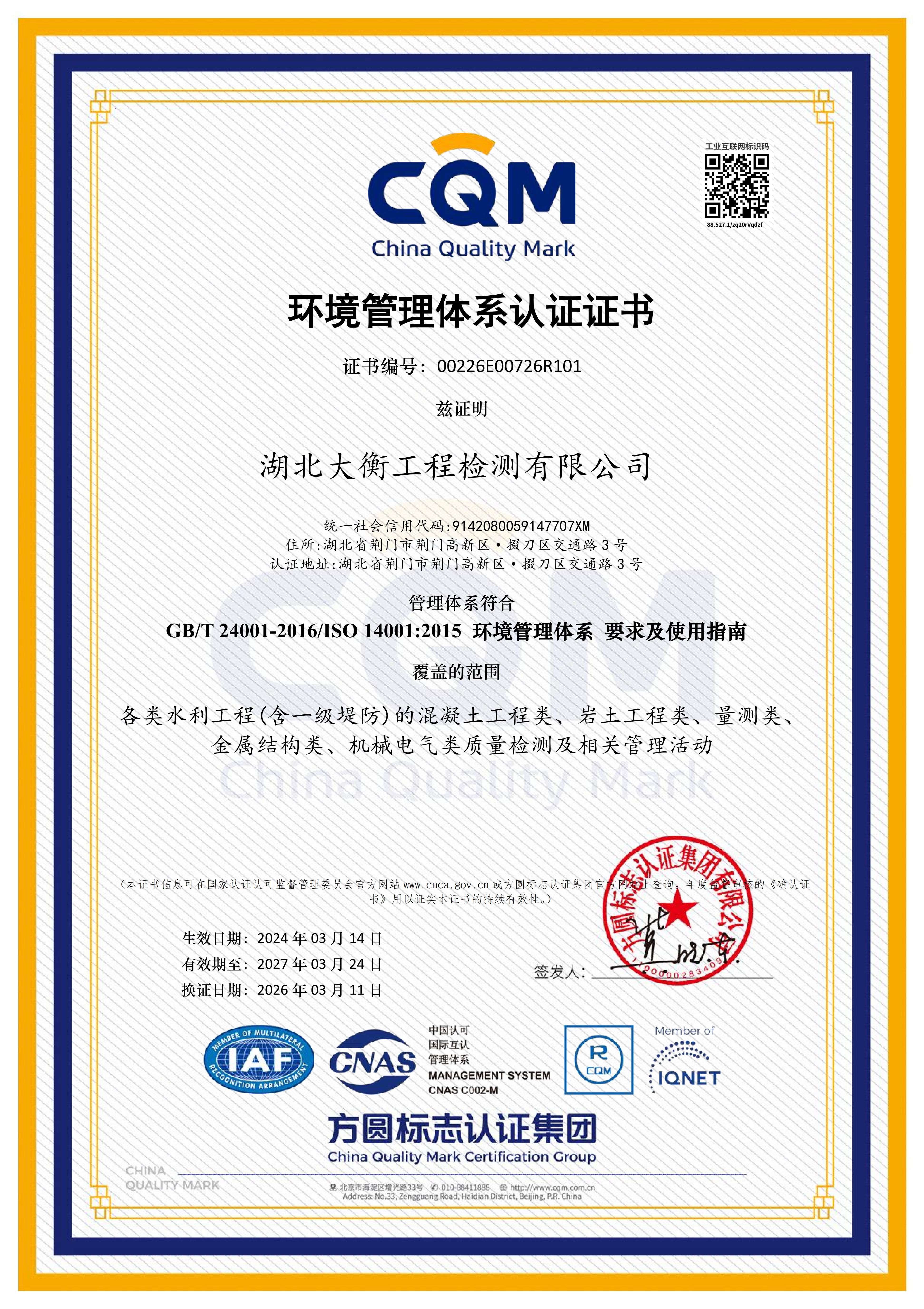3月11日,市凯发·K8水务集团下属子公司湖北大衡工程检测有限公司(以下简称“大衡公司”)顺利顺利获得QEO(质量、环境及职业健康安全)三体系再认证。