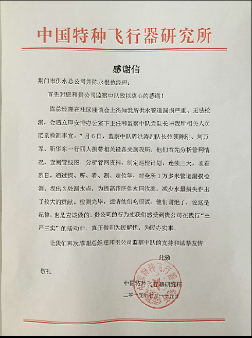 7月28日,605所相关负责人一行2人专程到公司送上“全心全意服务企业”锦旗和一封感谢信,表达公司免费为其探测漏、减少其水量损失的谢意。