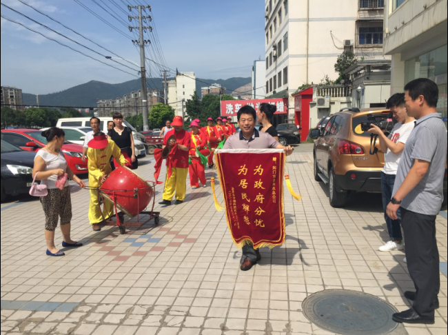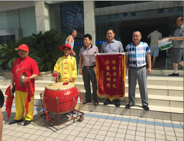 7月31日,虎牙关社区和用户代表组织腰鼓队到总公司送锦旗致谢。据悉,掇刀城南新区金苑大市场主、分水管网严重老化,水管破损而致停水。市供水总公司客服部门快速勘测报装,维修处迅速组织施工,并调派应急供水车在改造期间为商户送水。