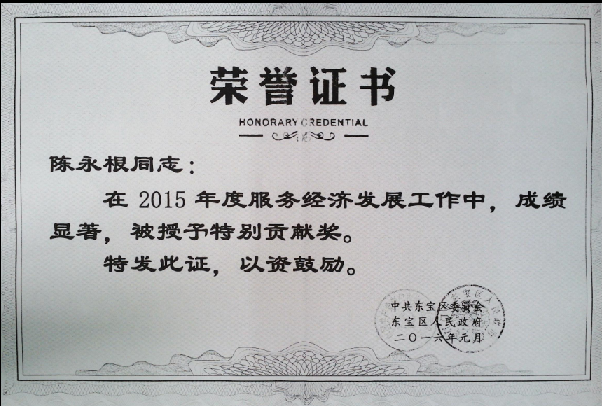 近期,公司因服务“四区两园”成绩突出,党委书记、总经理陈永根被东宝区委、区政府授予“服务经济开展工作特别贡献奖”。