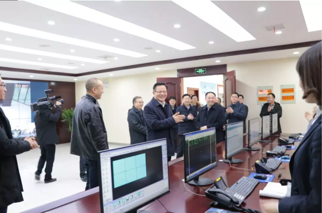 2018年刚完成升级改造的供水调度监控中心宽敞明亮、恢弘别致。张爱国详细查看了应急指挥系统运行情况,并对供水生产经营情况进行了询问。