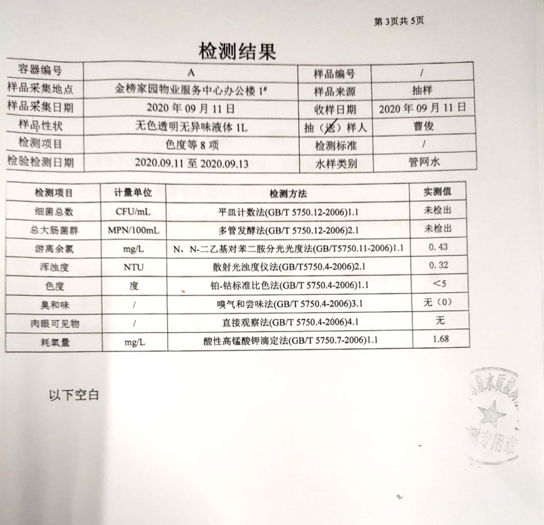 本着“用户至上”的服务宗旨,为彻底消除用户对荆城自来水水质问题的疑虑,检测人员再次进行现场抽样,并将水样送至有相关检验检测资质的第三方检测组织—荆门市咏泉水质检测有限公司进行检测。检测结果显示该用户家中自来水各项指标均符合《生活饮用水卫生标准》(GB5749-2006)。具体检测项目及结果见下图: